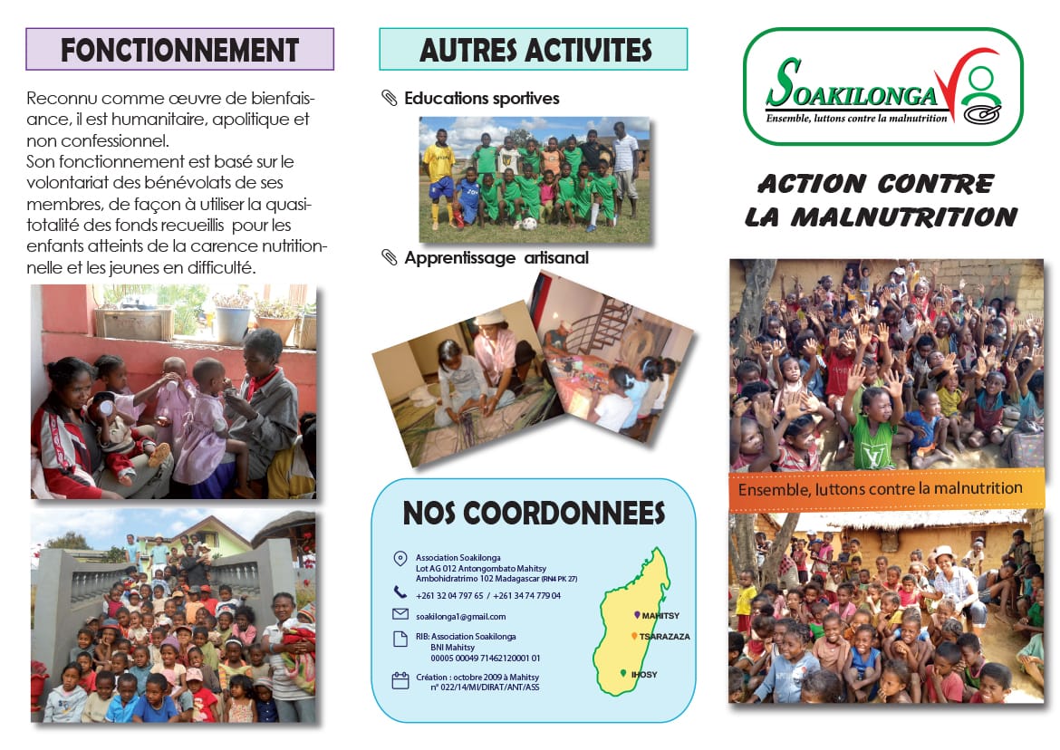 SOAKILONGA est une association humanitaire, non lucrative et basée sur le volontariat, dédiée à la lutte contre la malnutrition à Madagascar. Depuis sa création, l’association s’efforce d’améliorer la santé nutritionnelle des enfants issus de familles défavorisées, en particulier ceux âgés de six mois et plus.